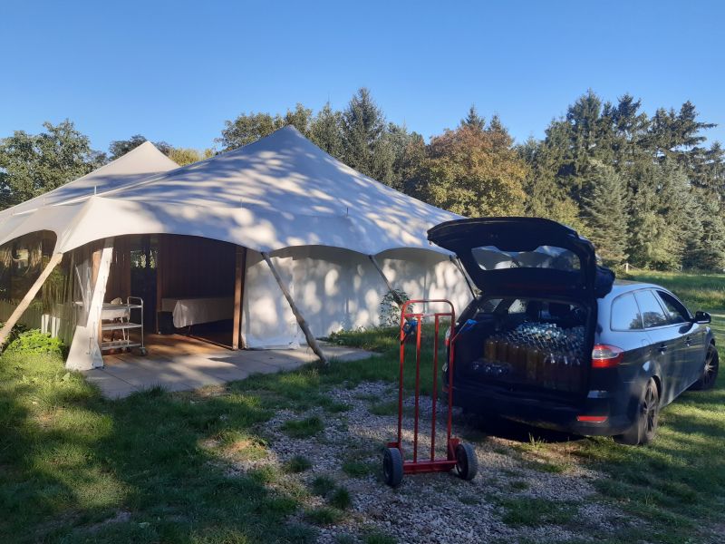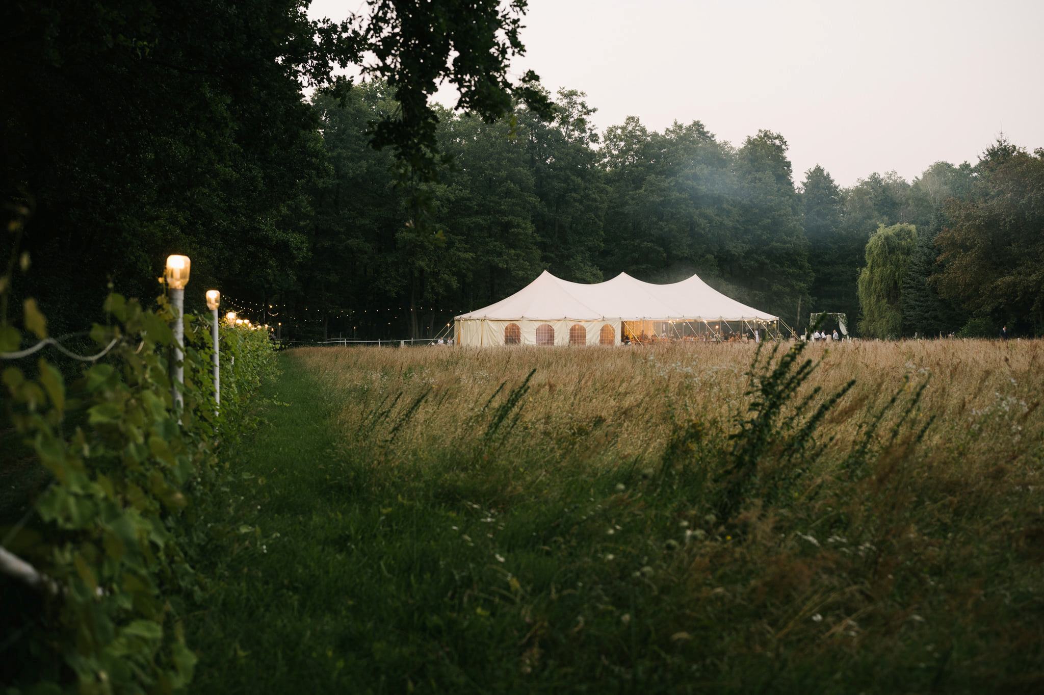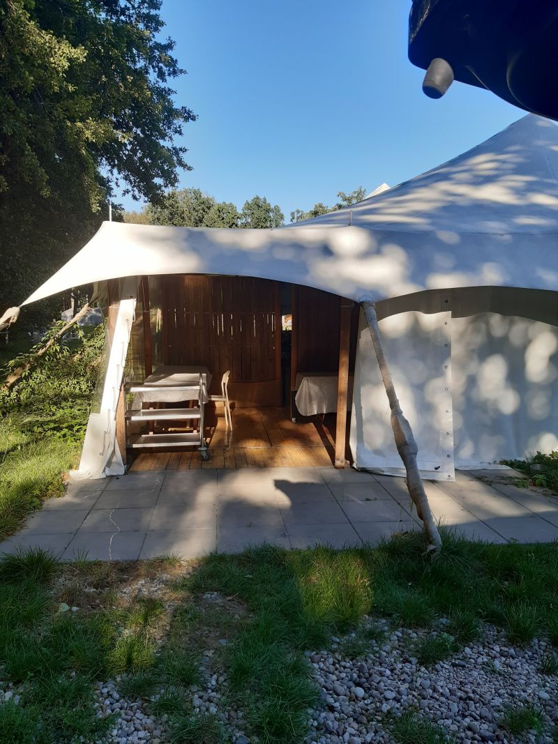 Namiot eventowy w Przystani Zbójna Góra to wyjątkowa przestrzeń na mapie Warszawy, stworzona z myślą o organizacji niezapomnianych wydarzeń. Na imponującej powierzchni 450 m² może pomieścić nawet do 200 gości, zapewniając komfort i swobodę podczas przyjęć. Jego niepowtarzalny charakter tworzy unikatowa konstrukcja z drewnianym parkietem oraz opuszczanymi, przezroczystymi ścianami, które pozwalają podziwiać malownicze otoczenie natury. Cały teren jest efektownie oświetlony, dzięki czemu wieczorami nabiera magicznego klimatu. Goście mają tu na wyciągnięcie ręki łąkę, staw i las jako idealne tło do relaksu, świętowania ważnych chwil oraz romantycznych sesji zdjęciowych.