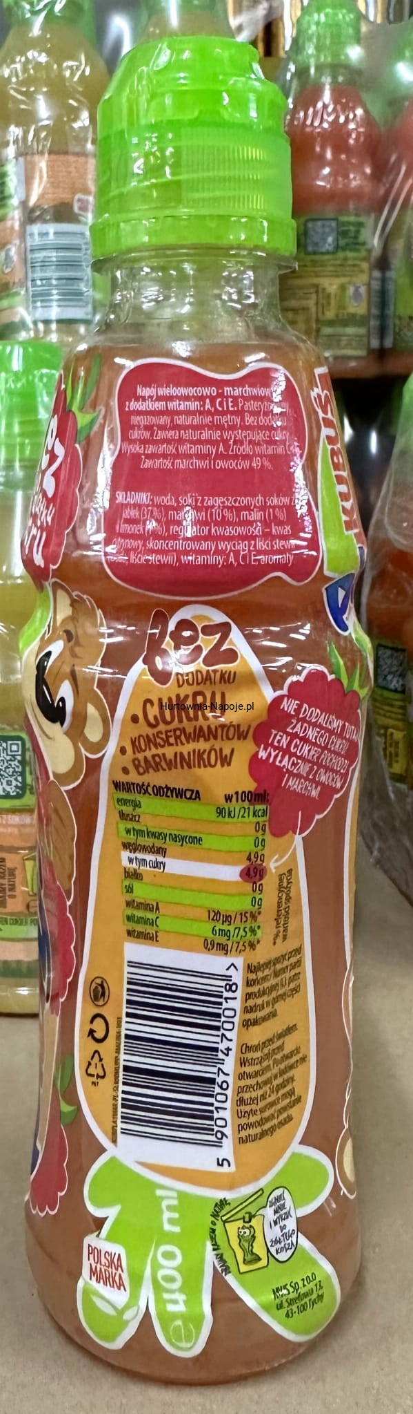 woda, sok marchwiowy z zagęszczonego soku(13%) , cukier, soki z zagęszczonych soków z: jabłek (3%), malin (2%) i limetek (2%), regulator kwasowości - kwas cytrynowy, witaminy: A, C i E, aromaty Zawartość marchwi i owoców 20%.