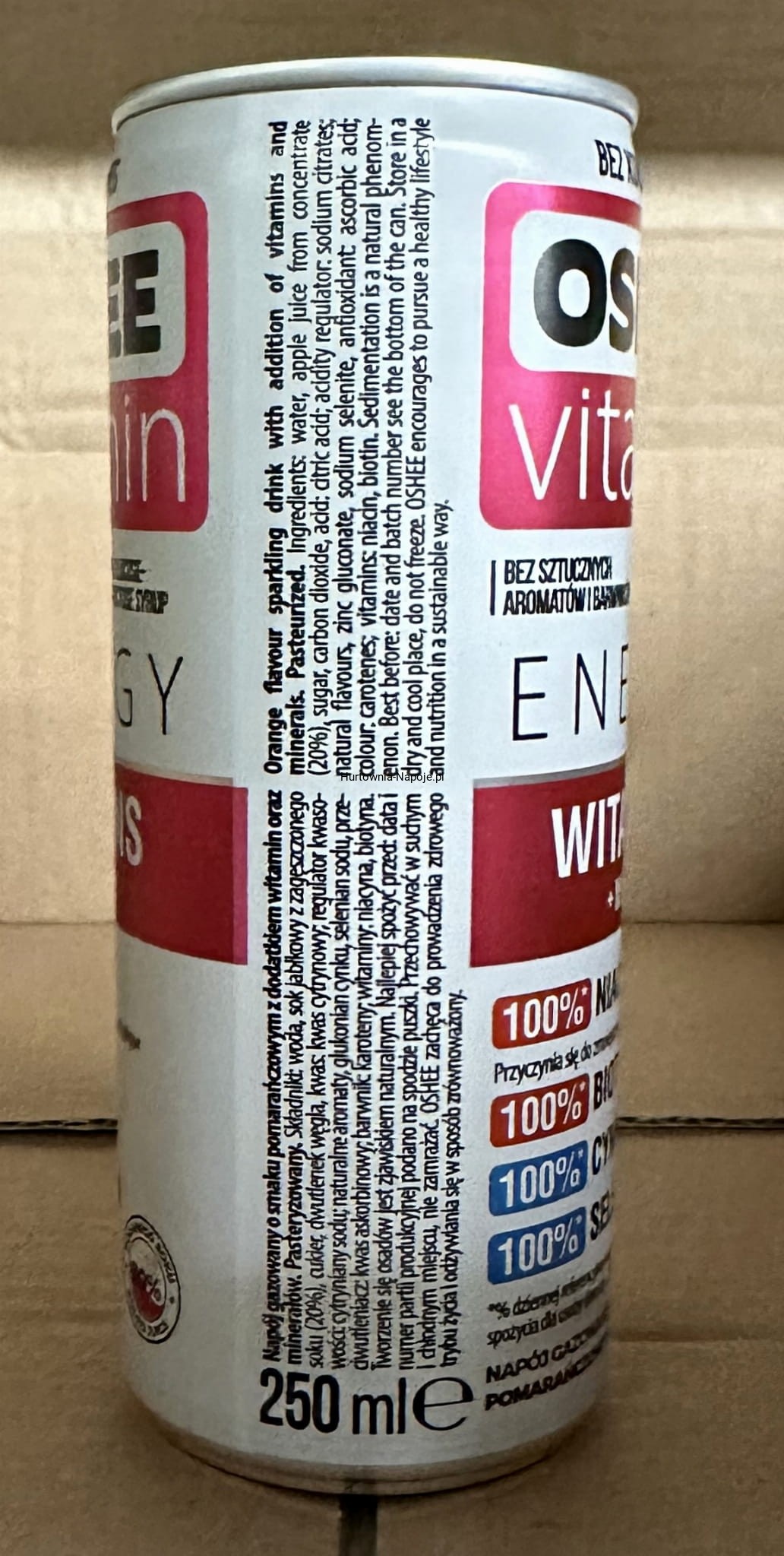 Oshee to witaminowy napój energetyczny, gazowany o wyjątkowym smaku słodkiej pomarańczy i mango. Zawarte w nim witaminy i minerały dostarczają jedną zalecaną dawkę dziennego zapotrzebowania na niacynę, kwas pantotenowy, witaminę B6, folacynę oraz żelazo. Ponadto Oshee napój gazowany zawiera istotną ilości tiaminy, biotyny, witaminy B12, cynku, a także jodu. Jest to napój o specjalnie opracowanej recepturze, którego składniki wzbogacające, pozytywnie wpływają na utrzymanie równowagi biochemicznej organizmu, jak również biorą aktywny udział w procesach przemiany materii.