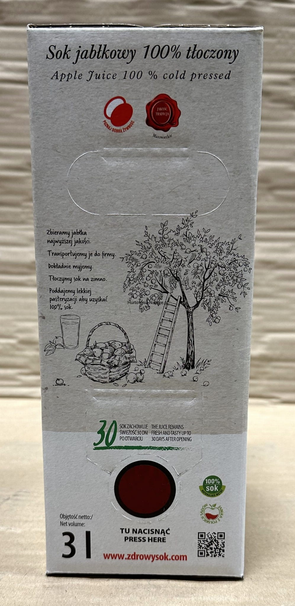 Przy nalewaniu naszego tłoczonego soku z kolejnego opakowania odkryjesz, że może się różnić od poprzedniego smakiem i kolorem. Tak toczy się życie w sadzie – używamy różnych odmian owoców, a ich soczystość i słodycz zależą od pogody podczas dojrzewania. Zaufaj mądrości natury do samego końca. Jeśli zauważysz, że w szklance wytrąca się osad, możesz mieć pewność, że z cząstkami miąższu otrzymasz pełnię smaku i zdrowia.