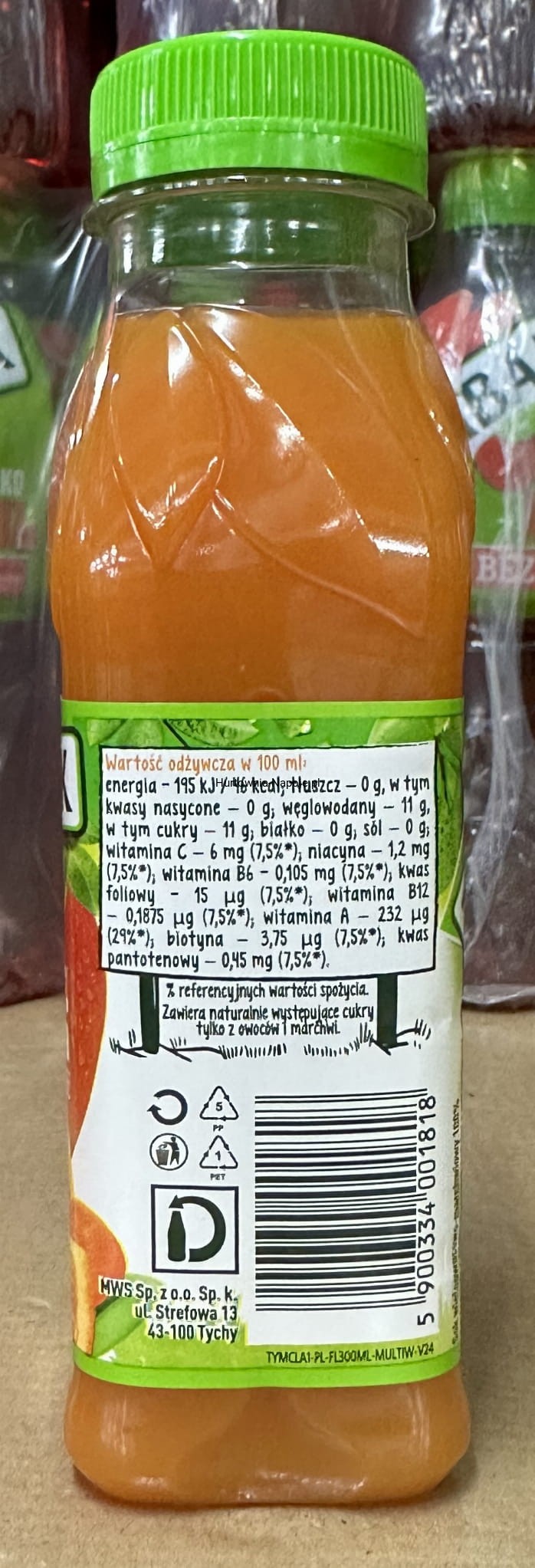 Sok wieloowocowo-marchwiowy 100 % częściowo z zagęszczonych soków z witaminami. Pasteryzowany. Źródło witamin: A, C, B6, B12, niacyny, biotyny, kwasu foliowego i kwasu pantotenowego.